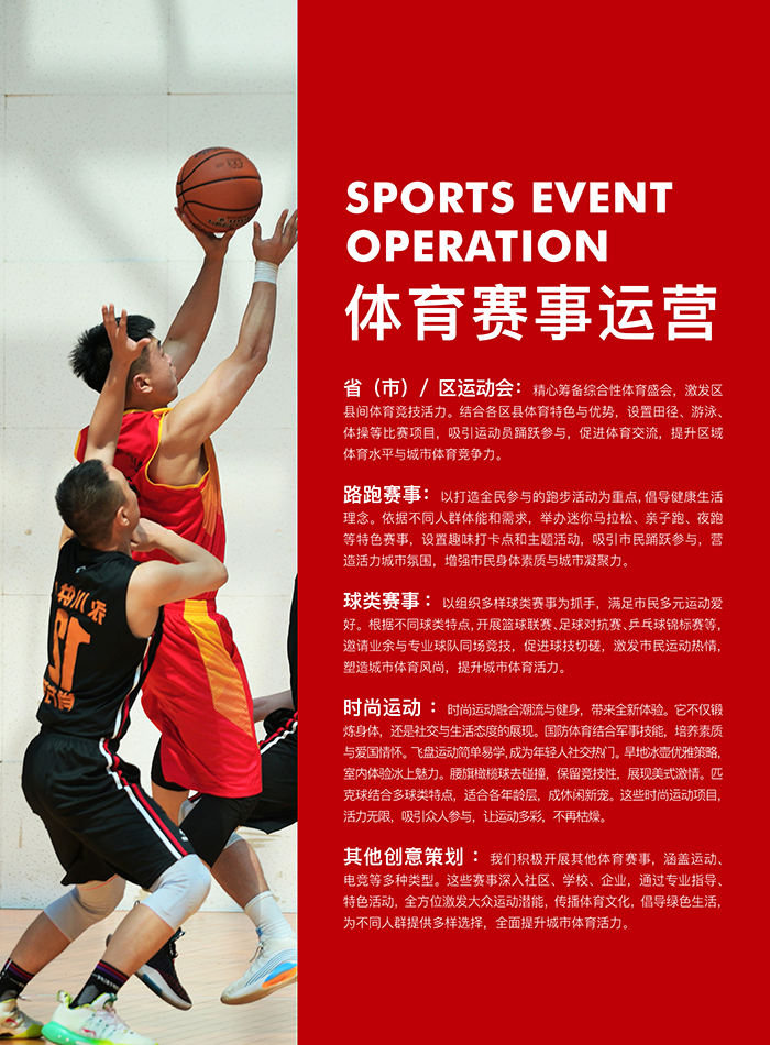 在健康中國戰(zhàn)略指引下,全?健?熱情不斷?漲 。動也開展各類?拉松、?徑運(yùn)動會、球類賽事,?上運(yùn)動會、體操?賽、拔河?賽等,?有賽事IP“愛定向”“四分?”“奔跑江蘇”“中國?三?四分?”“夢之藍(lán)·冰壺挑戰(zhàn)賽”等,展現(xiàn)??群眾敢于拼搏、積極奮?的精神?貌,增強(qiáng)政企事業(yè)單位的活?和競爭?,為其在新時代的發(fā)展提供更加?闊的空間。